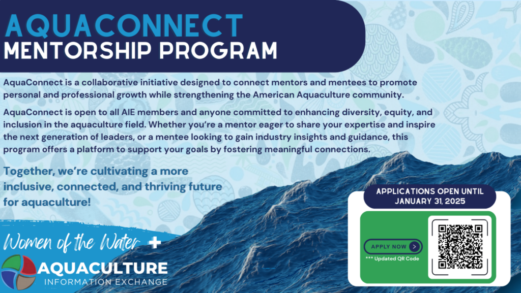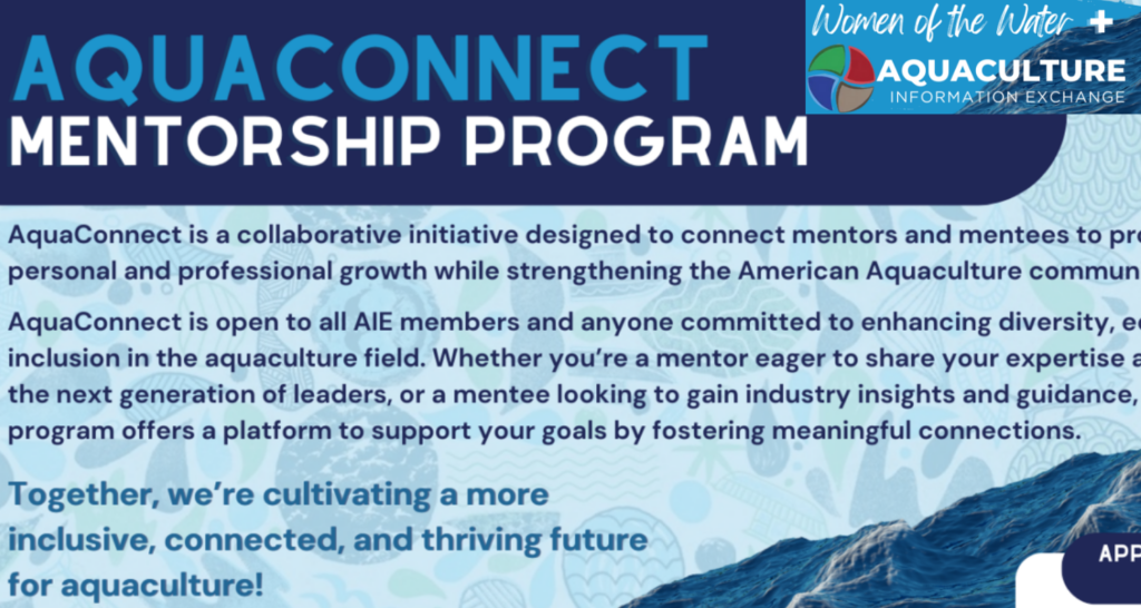 AquaConnect, a mentorship program collaboration between Women of the Water and the Aquaculture Information Exchange, is still accepting applications! Apply to be a mentor or mentee by January 31st! >> Apply Here